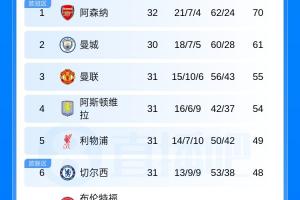 还有悬念!英超积分榜:阿森纳多赛2场领先9分,曼城将客战切尔西